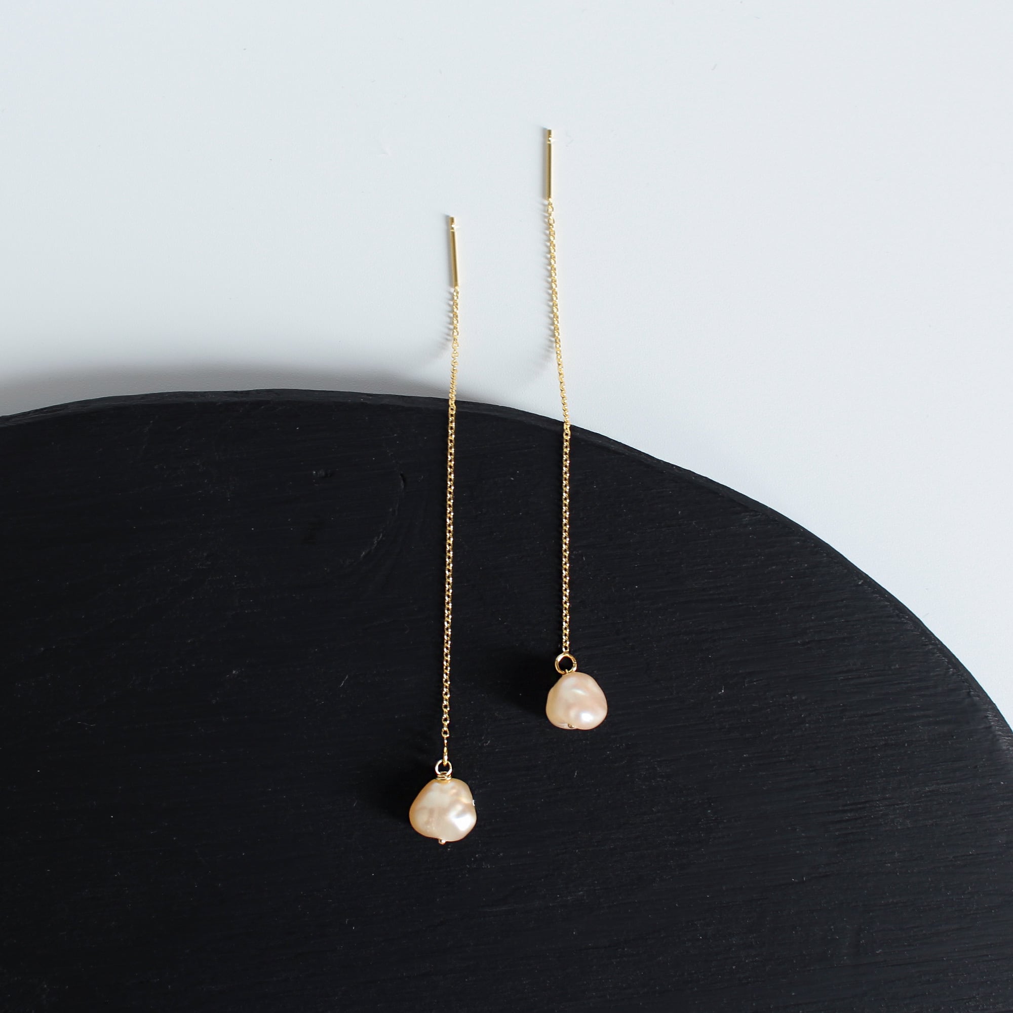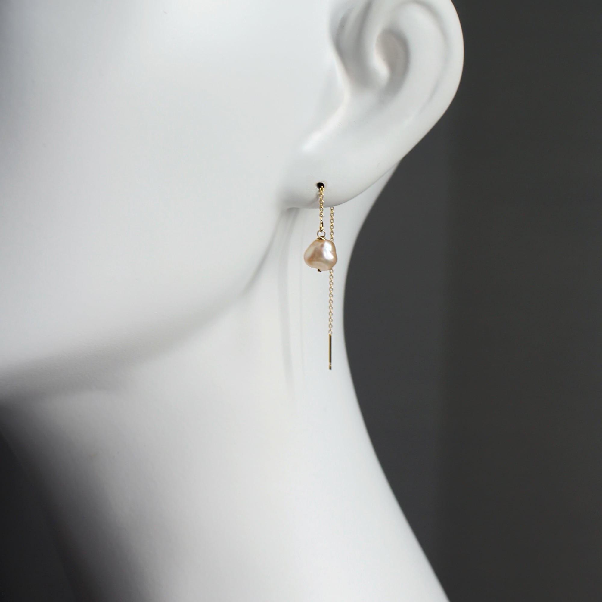 繊細なチェーンの先に、一粒のパールをあしらったロングピアス。